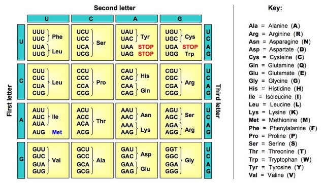 Messenger rna codons and amino acids for which they code.